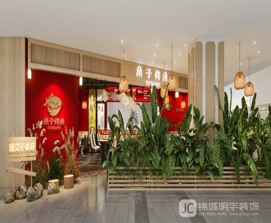 魚(yú)子烤魚(yú)店的裝修設(shè)計(jì)突顯了現(xiàn)代與自然的完美融合。正門(mén)紅色主墻與金色魚(yú)標(biāo)志相得益彰,營(yíng)造出熱情而溫暖的氛圍。店內(nèi)采用大量綠植裝飾,增加了空間的生機(jī)與活力。木質(zhì)元素的運(yùn)用使整體風(fēng)格簡(jiǎn)約而不失質(zhì)感,吊燈的設(shè)