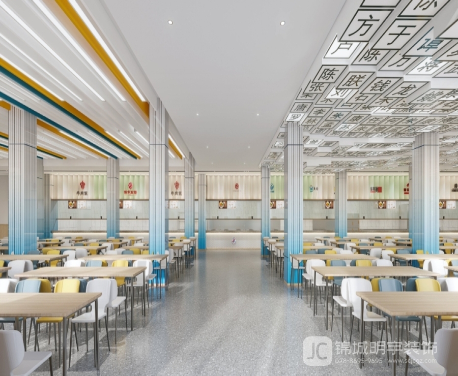 錦城明宇裝飾公裝公司為雅安學(xué)校食堂精心打造了一個(gè)現(xiàn)代化、溫馨且功能齊全的用餐環(huán)境。在設(shè)計(jì)上,我們注重空間的明亮與開(kāi)闊,充分利用大面積窗戶(hù)引入自然光線(xiàn),使整個(gè)空間顯得更加通透明亮。天花板采用了獨(dú)特的幾何圖案