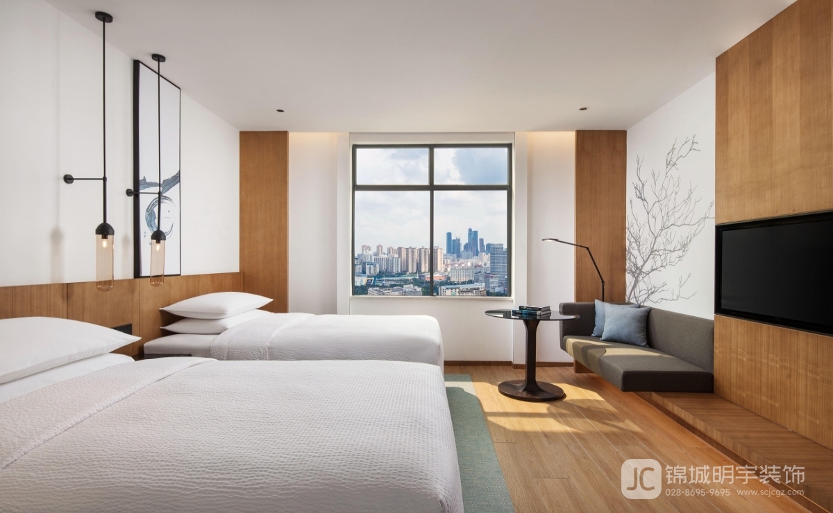 客房設(shè)計(jì)注重細(xì)節(jié)與舒適。寬大的窗戶不僅引入自然光,還讓客人欣賞到城市的美景。房間內(nèi)的家具以簡約的現(xiàn)代風(fēng)格為主,輔以東方的傳統(tǒng)元素,如墻上的水墨畫。這種設(shè)計(jì)不僅增添了藝術(shù)氛圍,還為忙碌的旅客提供了一處寧靜的休憩之所。床頭燈采用懸掛式設(shè)計(jì),既節(jié)省空間,又增添了一絲現(xiàn)代感。