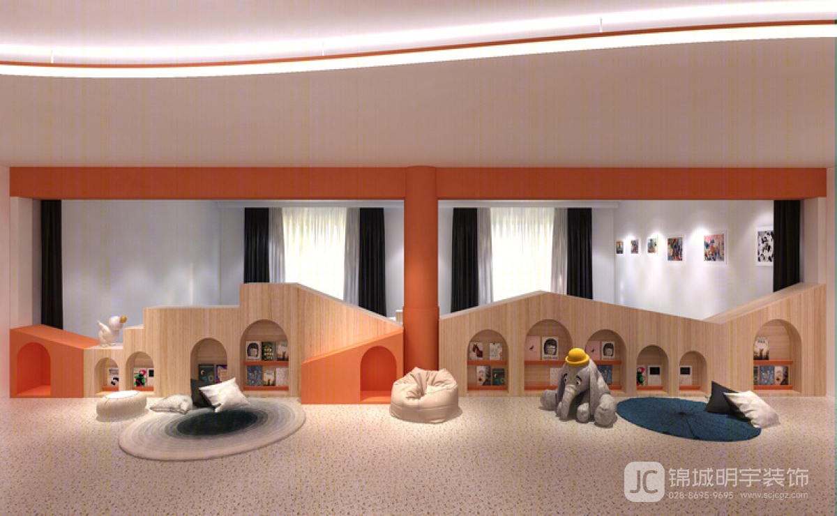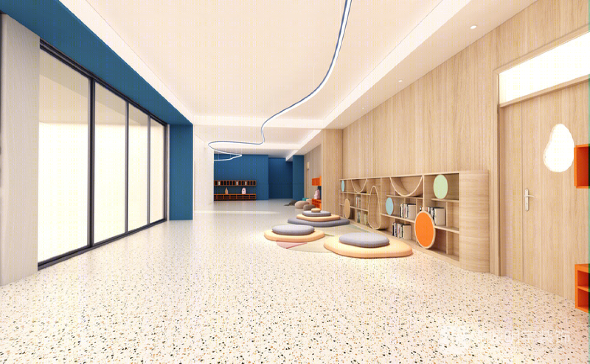 多元功能區(qū)的設立:為了滿足不同教育活動的需求,我們設計了多個功能區(qū)。開放式的閱讀區(qū)和學習區(qū),使用柔軟的地毯和舒適的坐墊,為孩子們提供舒適的閱讀和學習環(huán)境。色彩豐富的書架設計,不僅增加了趣味性,還能激發(fā)孩子們的好奇心和求知欲。