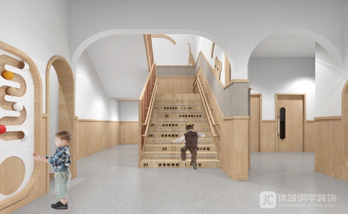 安全與教育并重:在設(shè)計(jì)中,安全性始終被放在首位。樓梯扶手的高度經(jīng)過(guò)精心設(shè)計(jì),確保孩子們?cè)谏舷聵翘輹r(shí)的安全。墻角和家具的圓角設(shè)計(jì)減少了意外碰撞的風(fēng)險(xiǎn)。此外,墻面上設(shè)置了教育性的游戲裝置,讓孩子們?cè)谧呃戎幸材苓M(jìn)行簡(jiǎn)單的數(shù)學(xué)和邏輯訓(xùn)練,寓教于樂。色彩的柔和搭配:色彩的選擇上,設(shè)計(jì)師選用了柔和的自然色調(diào),如淺木色、白色和綠色。這些色彩不僅與自然元素相呼應(yīng),還能讓孩子們?cè)谝曈X上感到舒適和放松。局部的亮黃色作為點(diǎn)綴,為空間增添了活力和趣味。