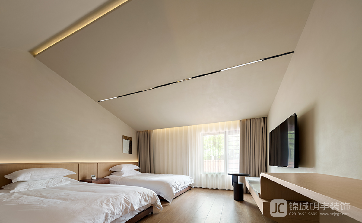 自然元素的融入:自然元素的引入是錦城裝飾設(shè)計的另一大亮點。大面積的落地窗設(shè)計不僅讓充足的自然光灑滿整個空間,還為住客提供了欣賞外部自然景觀的絕佳視角。窗外的綠植與室內(nèi)的自然色調(diào)相呼應(yīng),形成了內(nèi)外一致的和諧感。