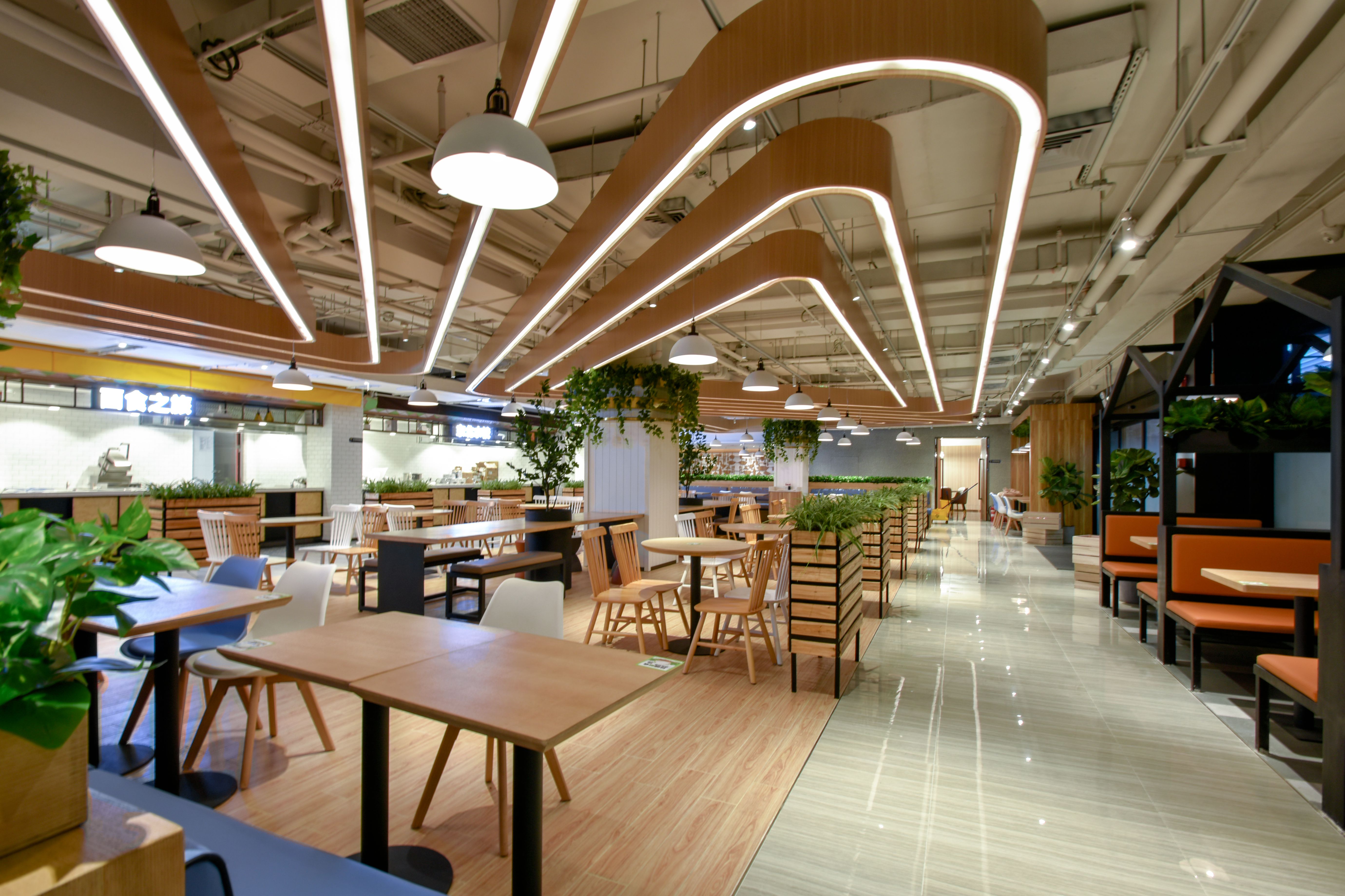 現(xiàn)代設(shè)計:現(xiàn)代設(shè)計強調(diào)簡約與功能性。在食堂的設(shè)計中,我們使用了簡潔的線條和中性色調(diào),搭配自然的木質(zhì)材料,營造出現(xiàn)代感十足的就餐環(huán)境。懸掛的燈飾與天花板的線條設(shè)計相呼應(yīng),形成了強烈的節(jié)奏感,使整個空間更加富有層次感。間布局多樣化的就餐區(qū)域:為了滿足不同人群的就餐需求,我們設(shè)計了多種類型的就餐區(qū)域。開放式的長桌適合團隊聚餐,而私密性較強的小隔間則為個人或小團體提供了一個安靜的就餐空間。這樣的布局設(shè)計使得食堂既能夠容納大量的就餐人群,又能為每位顧客提供個性化的用餐體驗。