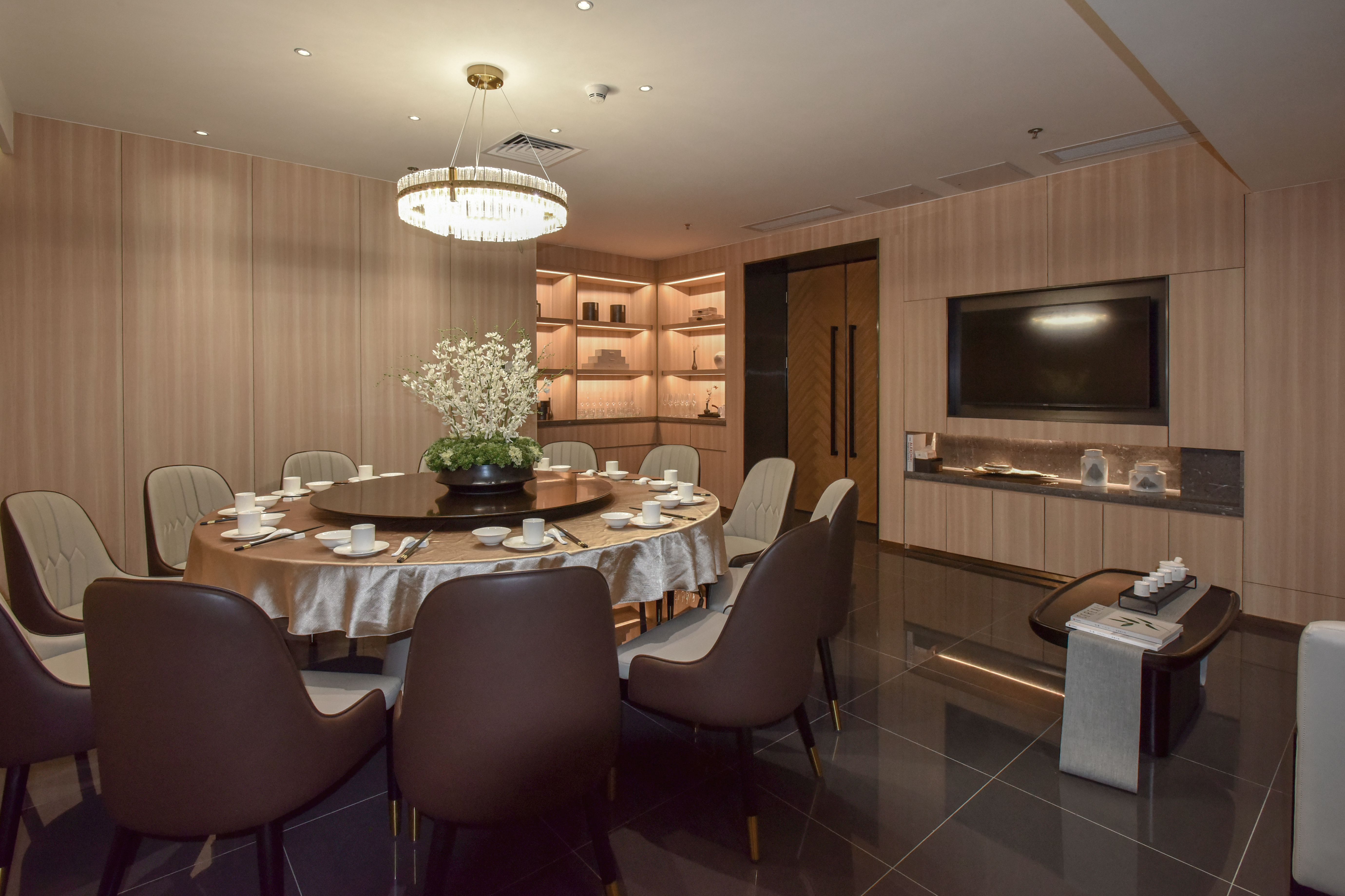 色彩搭配:在色彩上,我們選擇了以綠色為主的自然色調(diào),搭配淺木色與白色,形成了一種和諧且富有層次感的視覺效果。這樣的色彩搭配不僅讓人感到放松,也提升了就餐環(huán)境的整體品位。細節(jié)設(shè)計燈光設(shè)計:燈光的設(shè)計在整個食堂的氛圍營造中起到了關(guān)鍵作用。我們采用了多層次的照明設(shè)計,通過不同亮度與色溫的燈光搭配,營造出溫馨而不失現(xiàn)代感的就餐氛圍。吊燈與筒燈的結(jié)合使用,不僅提供了充足的照明,也成為了空間中的一大視覺亮點。