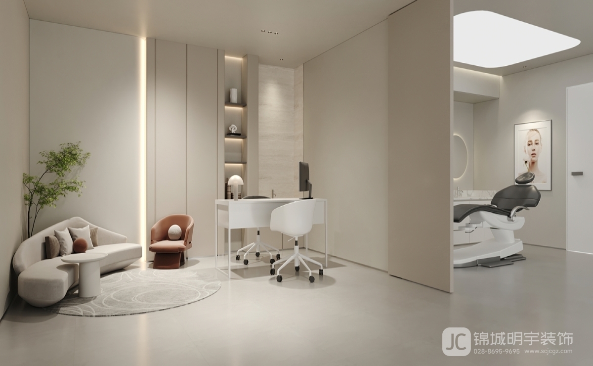 醫(yī)美行業(yè)的蓬勃發(fā)展對(duì)空間設(shè)計(jì)提出了更高的要求。一個(gè)成功的醫(yī)美空間不僅僅是一個(gè)提供服務(wù)的地方,它更是一個(gè)讓客戶感受到舒適、專業(yè)和信任的場(chǎng)所。設(shè)計(jì)師在塑造這樣一個(gè)空間時(shí),需考慮多種因素,包括色彩搭配、材質(zhì)選擇、燈光設(shè)計(jì)以及功能布局等。設(shè)計(jì)理念:現(xiàn)代簡(jiǎn)約與優(yōu)雅結(jié)合從入口的設(shè)計(jì)開(kāi)始,現(xiàn)代簡(jiǎn)約的風(fēng)格貫穿整個(gè)醫(yī)美空間。清晰的線條、簡(jiǎn)約的色彩和高品質(zhì)的材質(zhì)運(yùn)用,使整個(gè)空間散發(fā)出一種優(yōu)雅而不失現(xiàn)代感的氛圍。墻壁采用淺色調(diào),搭配簡(jiǎn)約的裝飾畫(huà),營(yíng)造出一種寧?kù)o和諧的視覺(jué)效果。