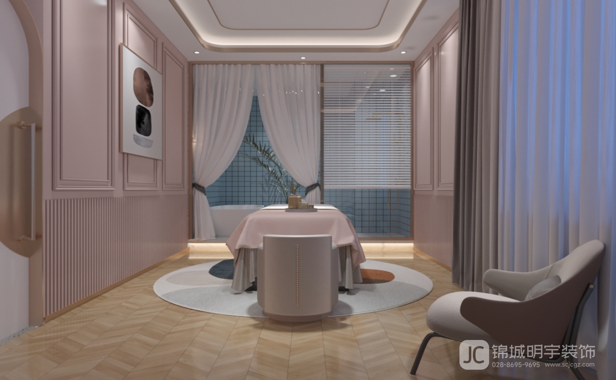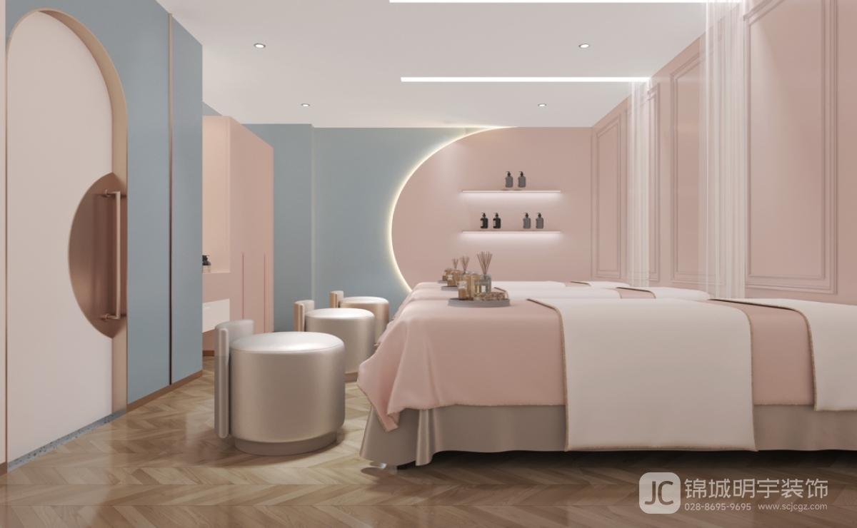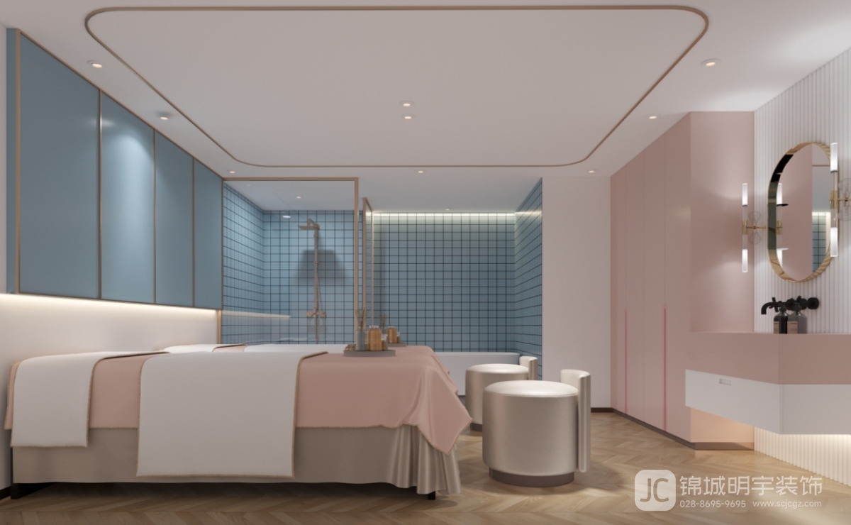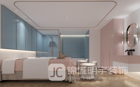 私密空間:私密空間的設(shè)計注重細節(jié)的處理。墻面的藍色瓷磚與粉色墻面形成鮮明對比,增加了視覺的層次感。圓形鏡子的設(shè)計不僅實用,同時也為整個空間增添了一絲現(xiàn)代感。室內(nèi)的燈光設(shè)計采用了可調(diào)節(jié)的暖光源,能夠根據(jù)不同的護理項目調(diào)節(jié)光線,提升客戶的舒適體驗。