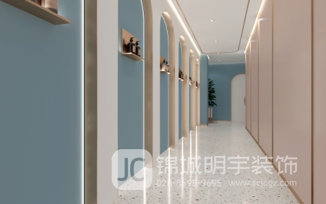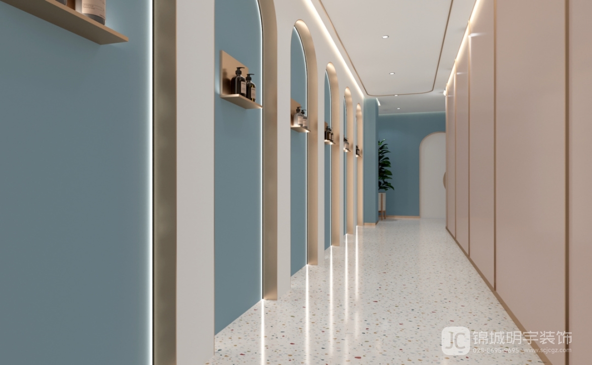 走廊設(shè)計:走廊部分采用了藍色與金色的搭配,墻面的拱形設(shè)計增添了空間的層次感。藍色墻面讓人聯(lián)想到海洋的寧靜,與金色的裝飾相得益彰,仿佛置身于落日下的海邊,充滿了詩意。地面選用了淺色系的瓷磚,反射出溫暖的光線,讓整個走廊顯得更加明亮寬敞。